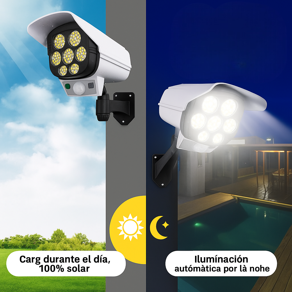 Durante el día carga con energía solar ☀️ y en la noche se enciende automáticamente 🌙, ahuyentando intrusos y garantizando la mejor iluminación.